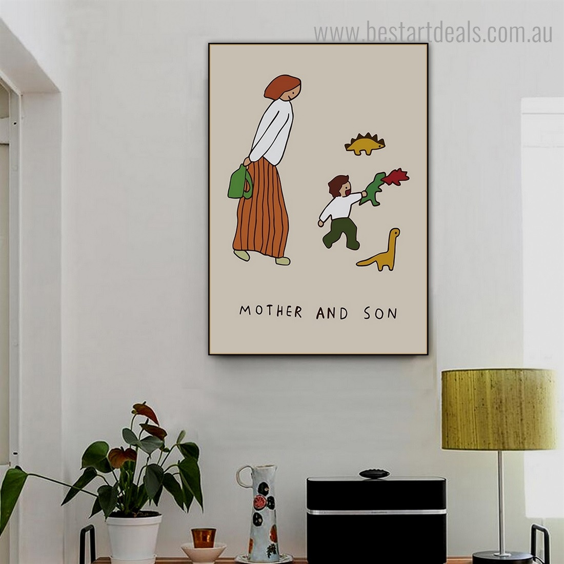 A mother following his son playing with little dinosaur toys printed with bright colors is a must have cool kids art print to decorate your walls.