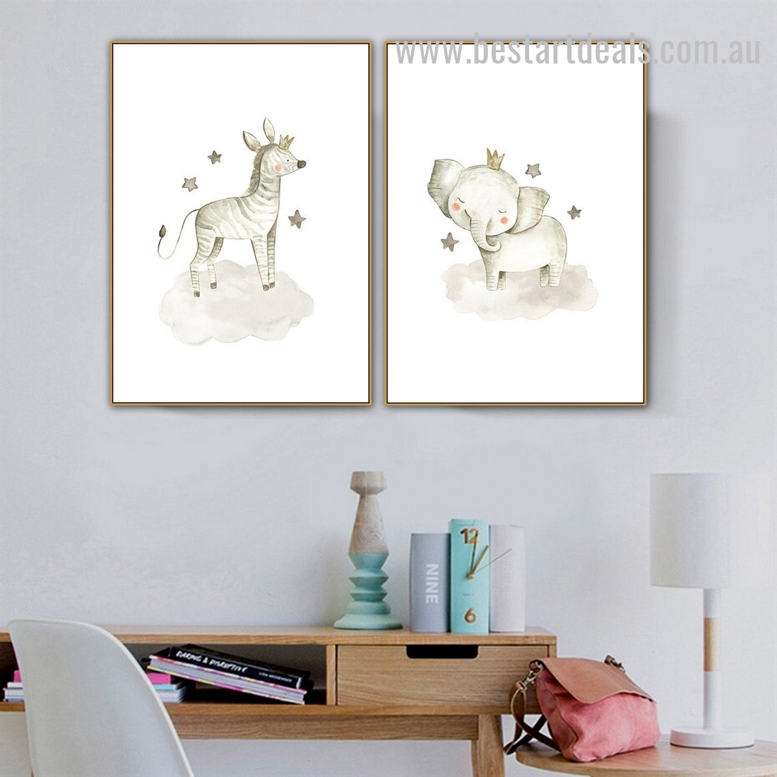 Two very cute art prints of zebra and elephant both with a small golden crown will look so appealing together on the walls of your children’s room.