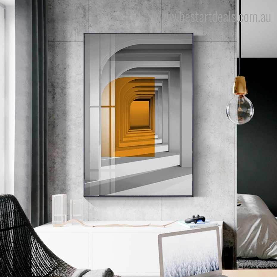This orange shade geometrical shaped art print shows a cave as one of the best examples of unique contemporary architecture wall prints.