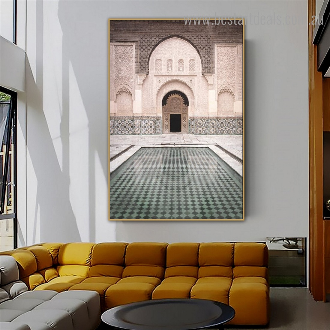 An extraordinarily beautiful art print of the courtyard of Ben Youssef having an Islamic pilgrimage with beautiful Moroccan style tiles is undoubtedly going to enhance more positivity to your living room.