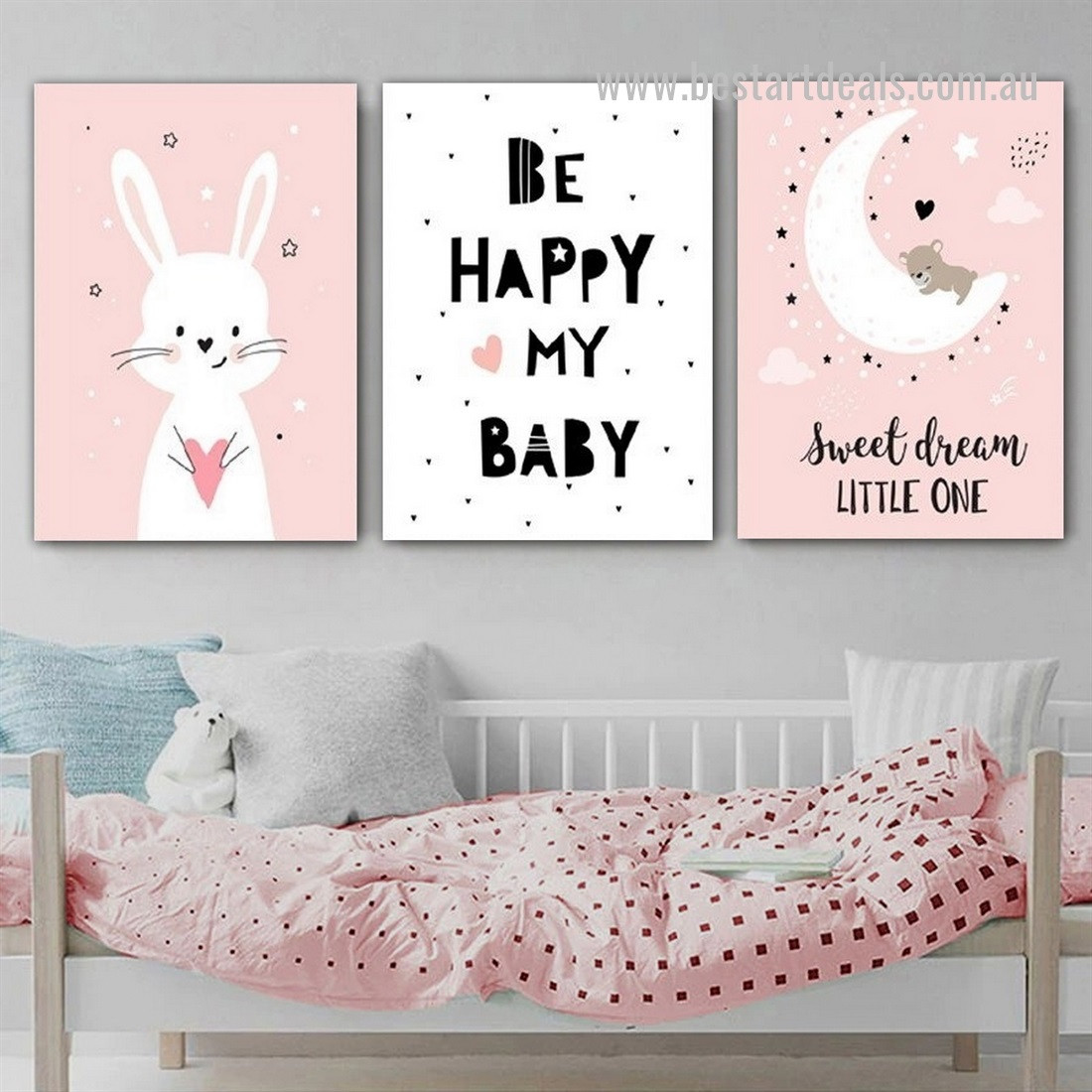 The background behind the bunny is pink, with multiple small dots. This framed artwork can also do that if you want to convey a message to your child during bedtime. Two messages are there on two different frames. One frame says, “BE HAPPY, MY BABY,” The message is written in black and bold letters over a white background.