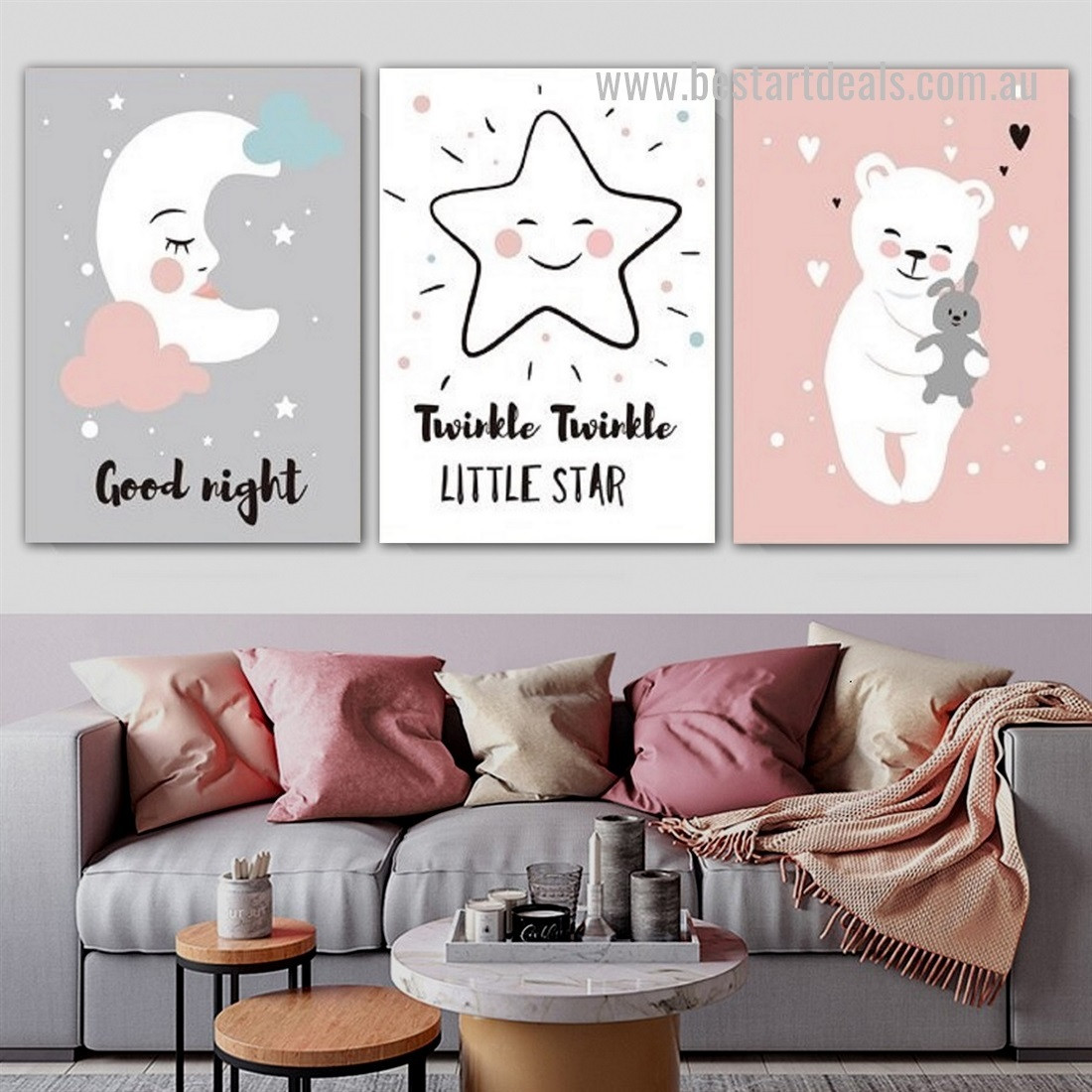 Three canvas panels with smiling stars, clouds, moons and bears. Your child will sleep through the night in no time. This print has been designed to offer the comfort and serenity that is appropriate for this scene.