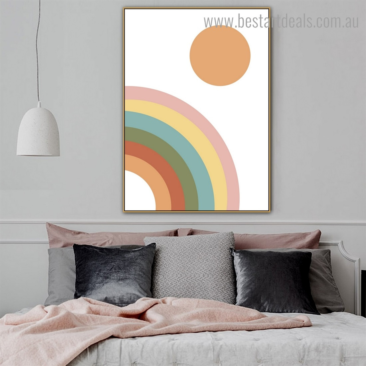 If you like it, you can immediately add it to your girl's bedroom if you think it would be a good fit. It is a minimalist piece of the framed poster that is abstract and depicts spots and stars. The color scheme has warm undertones and is well-suited for lending an easygoing and relaxed air to the space.