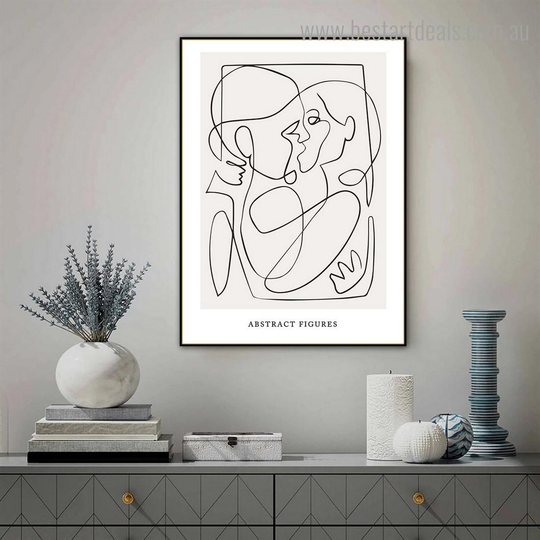 Though this is an abstract artwork, anyone can easily interpret the meaning of this piece of art. Two abstract figures are kissing each other passionately. The entangled nature of the bodies shows the deep love and affection that partners usually have for each other. Under the main body, the phrase "Abstract Figures" can be seen in black letters, and the artwork is printed on a white background.