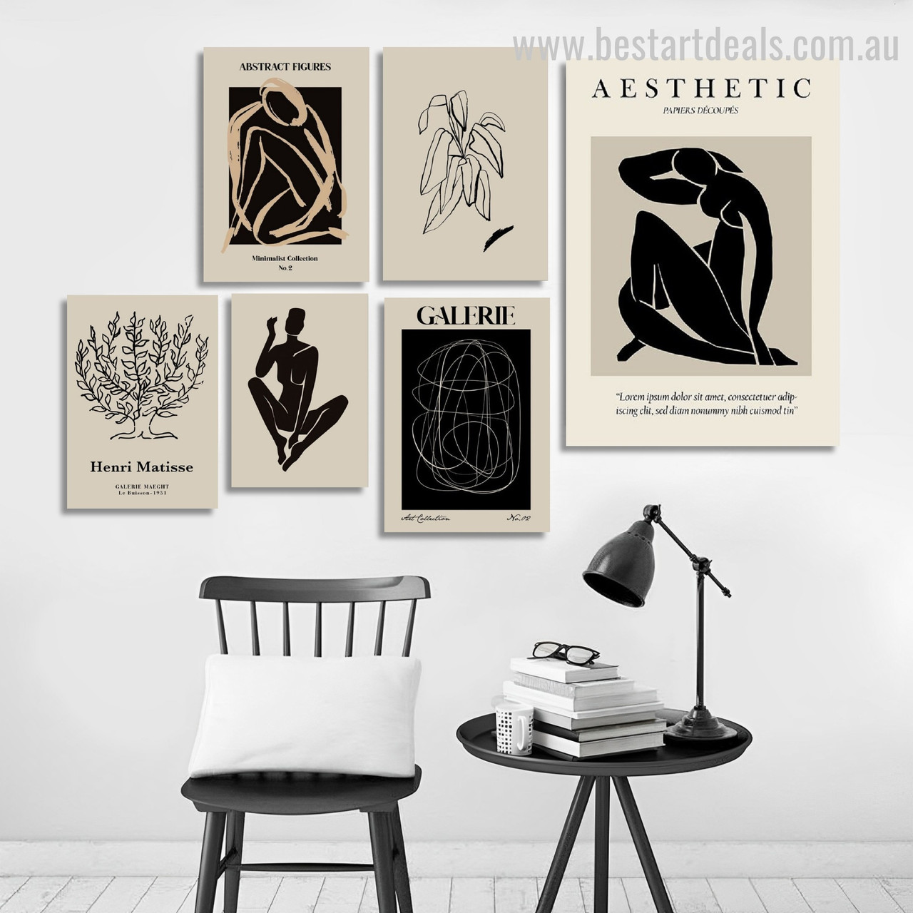 Henri matisse-inspired abstract canvas print set, featuring minimalist nude female figures, leaves, and trees with characteristic curved lines. This 6-piece framed art collection, drawing from the aesthetic of "papiers découpés" and galerie maeght le buisson 1951, offers scandinavian style for bedroom and living room decor. Each piece is a gallery-wrapped, stretched, and framed canvas.