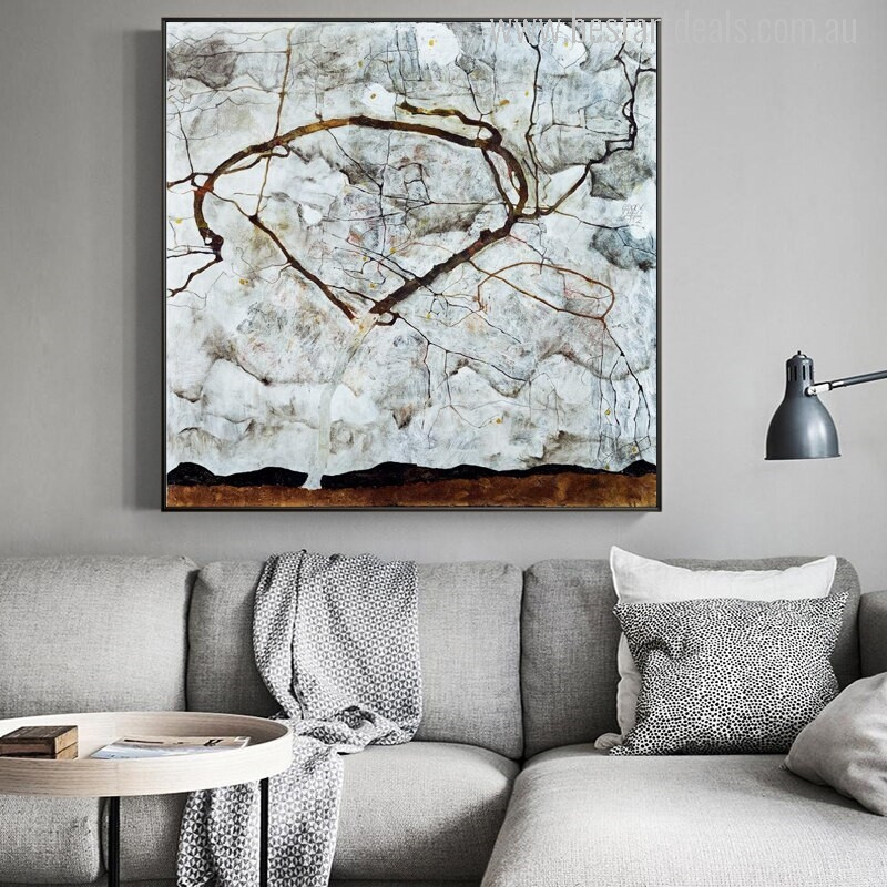 An abstract painting of an autumn tree by Egon Schiele. This painting shows a tree without leaves with white backdrop. This simply depicts the view of the autumn season. This barren branch of tree with a cracked backdrop makes it look like modern painting and admiring.