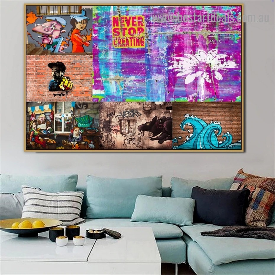 Motivating yourself might be a difficult task to do, but you always need to be creative. This artwork mainly delivers the message that you should never stop creating new things. Graffiti-style artworks and abstract paintings are included in this print, and the college is full of vibrant colors.