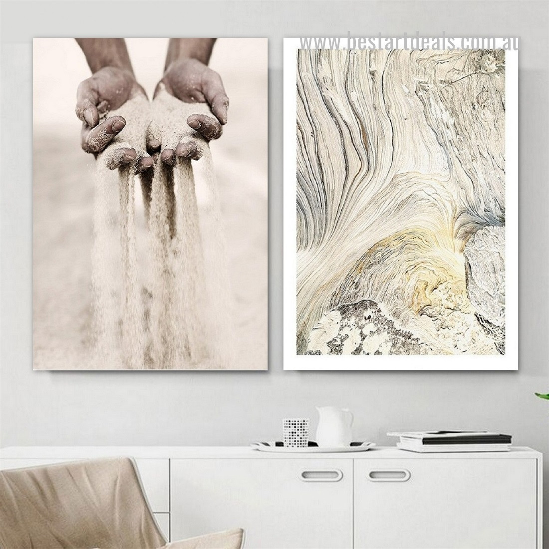 One metaphor is used to signify the nature of people and also the importance of time here in these prints. When you try to grab sand with your hands it will tend to slip away more with your tightening of the grip. And on the second canvas we can spot a marble slab having the texture of a tree bark. This marble symbolizes time and its effects on things.