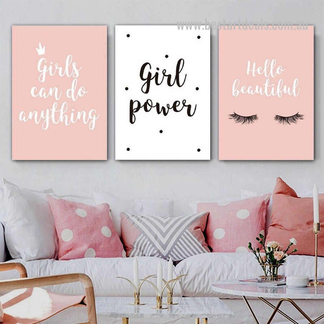 Women are no less than men in any field. What a man can do, a woman can do as good as a man and in some cases even better than that. All a woman needs to do is believe in her own potential. She should always remember that beauty is inside and what is outside does not determine who she is. To show your support towards the women in your life you can hang this printed artwork on your wall. This is another 3 piece artwork. In the first frame to show girl power, over a pink background white ink is used to print "Girls can do anything."
