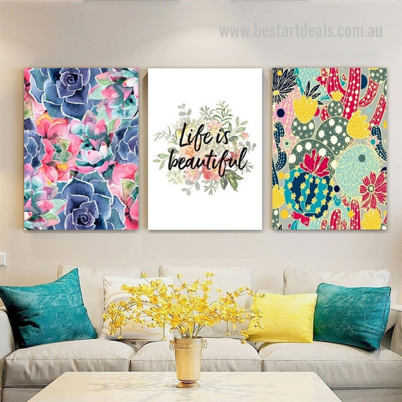 Flowers can bring joy and happiness to one's life. If you feel your interior walls with this inspirational artwork, it will surely cheer you up. Colorful roses are printed all over the first canvas. In the second one, the quote "Life is beautiful" is written in black over a white background from which flowers are popping out.