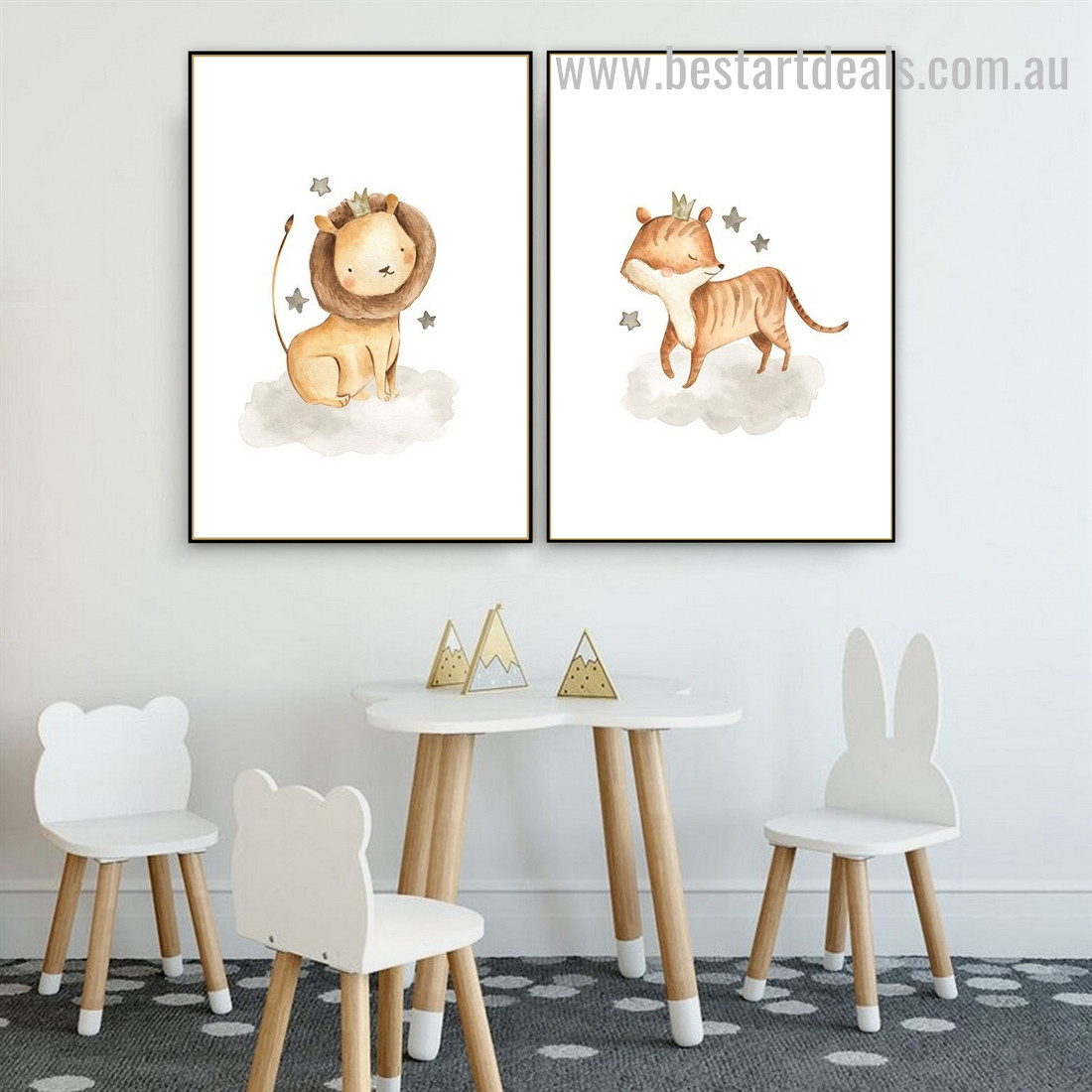 This 2 piece canvas art showing two caricatures speaks itself for its uniqueness. A special art form depicting wild animals is certainly going to entertain your children if hanged on the walls of their room. Every child is elated to see such characters that too if they are of their liking and choice. Moreover this kind of art is best for the Inquisitr mind of your kids.so hurry ! and bring this art for a special occasion to celebrate.